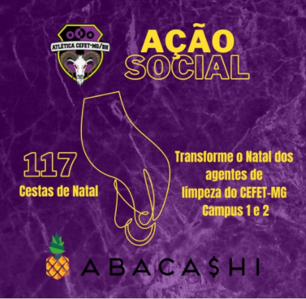 Você é nosso convidado(a) para participar de uma Ação Solidária, preparada com muito carinho por algumas equipes estudantis do Centro Federal de Educação Tecnológica de Minas Gerais (CEFET-MG). Nosso objetivo é de presentear com Cestas Natalinas os agentes de limpeza do grupo Conserva, que realizam todos os dias o importante trabalho de garantir a saúde, segurança e higiene do Campus 1 e Campus 2 do CEFET-MG. Nossa intenção é de proporcionar um Natal mais especial para cada servidor(a) que mediante ao seu trabalho diário impacta a vida de todos os estudantes e professores da instituição.