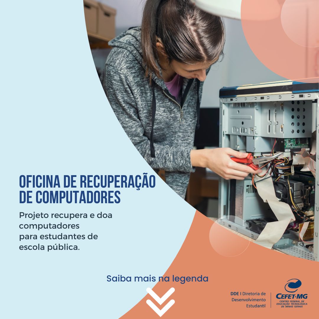 A “Oficina de recuperação de computadores”, foi iniciada em 2020 e é coordenada pela professora Sílvia Calmon do Departamento de Computação do CEFET-MG (DECOM). O objetivo do projeto é receber, recuperar e doar computadores para alunos que não possuem equipamento.
